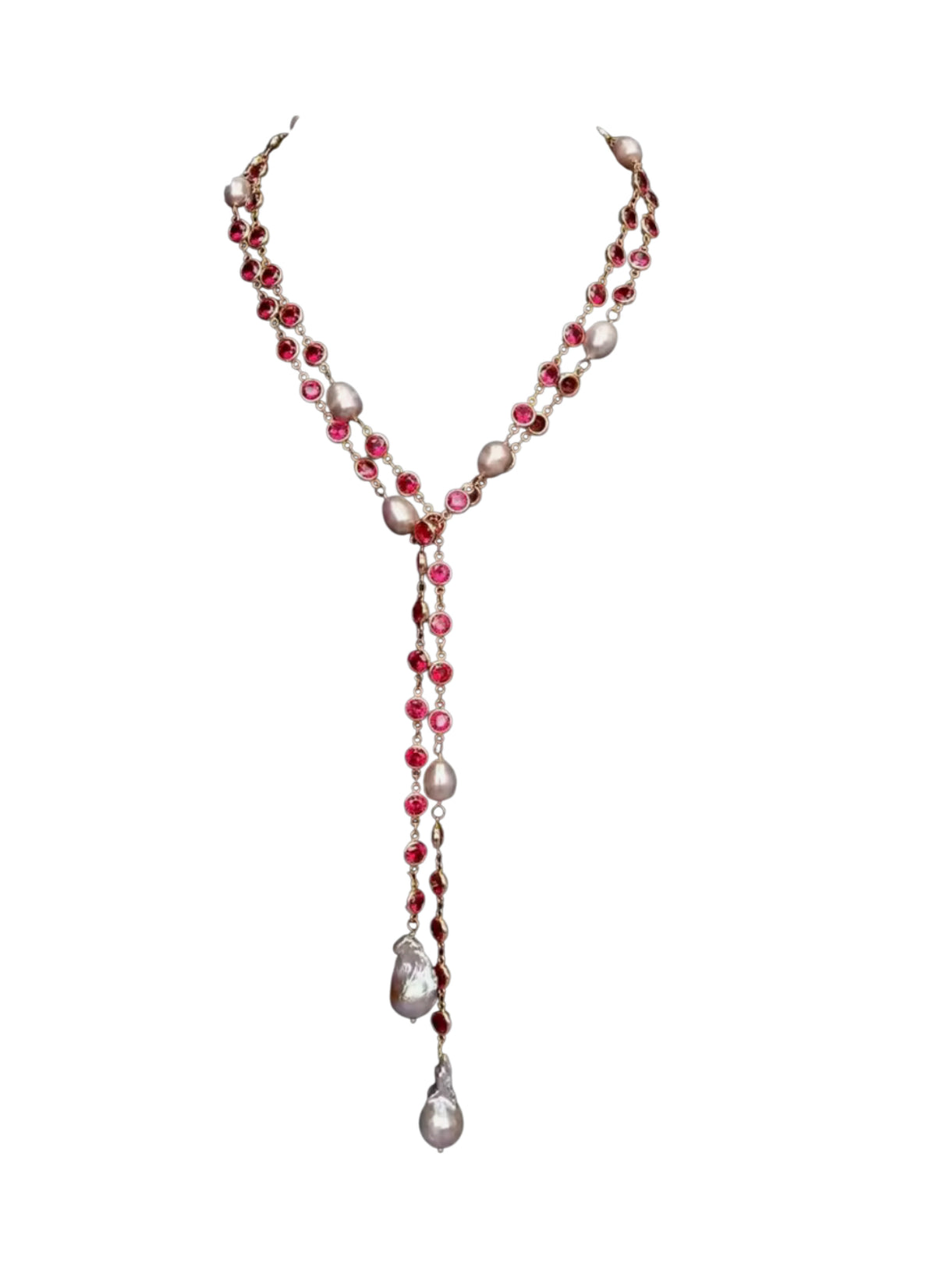 Long wrap natural pearl w Ruby stones necklace 49” long enough to wrap around twice to just wear it tied....